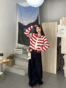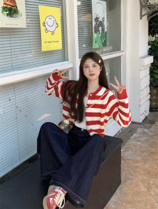 甜美风红白条纹长袖针织衫女2025秋季新款别致显瘦减龄chic上衣