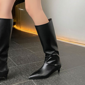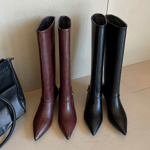 牛皮骑士靴女高筒长靴子秋冬新款真皮尖头细跟中跟及膝靴女直筒靴