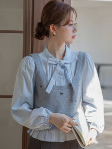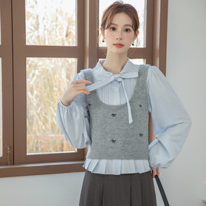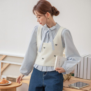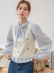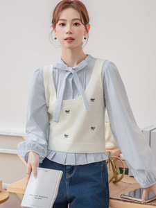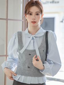 重刺绣时尚套装2025秋季新款复古圆领绣花针织马甲+蓝衬衣两件套
