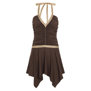 跨境美式复古风深V民族织带撞色拼接连衣裙女不规则褶皱挂脖短裙