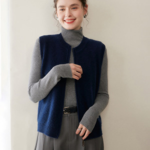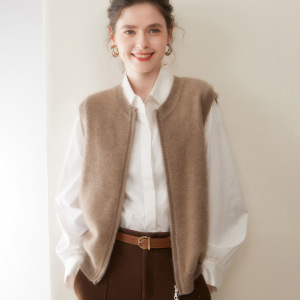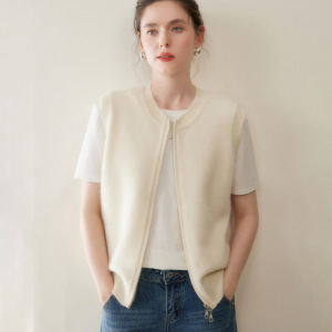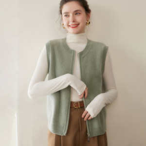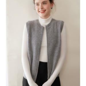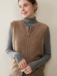 秋冬新款圆领拉链山羊绒开衫马甲女宽松简约休闲针织打底毛衣背心