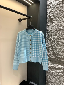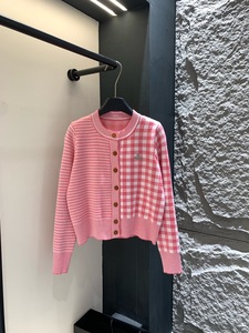 新款西太后针织开衫小土星刺绣双拼格纹设计感时尚甜美长袖毛衣女
