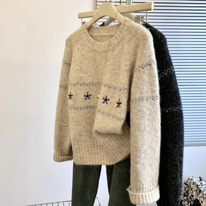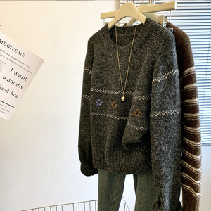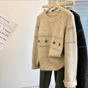 专柜撤回大牌剪标女装花朵刺绣套头毛衣女秋冬慵懒风宽松针织上衣