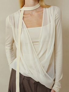 法式高级感荡领垂褶交叠网纱假两件丝绒挂脖长袖针织上衣