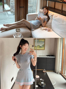 早安樊樊「Jennie蓝花楹」温柔毛感拼接针织连衣裙+开衫外套女秋
