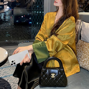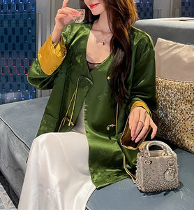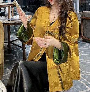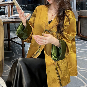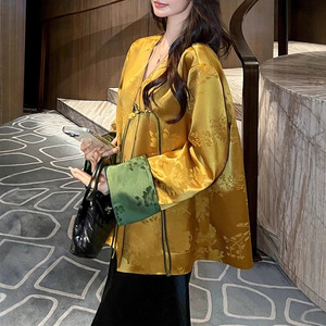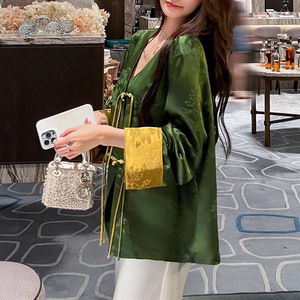 25新品新中式醋酸提花撞色拼接外套鎏金绿调宽松藏肉显瘦通勤上衣