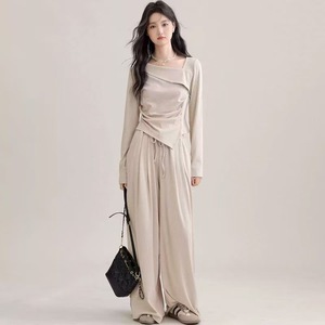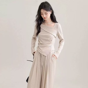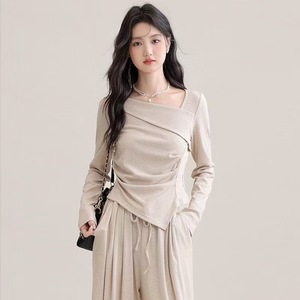 新品亚马逊欧美法式设计感斜领T恤女修身显瘦打底衫褶皱打底上衣