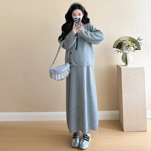 孕妇秋装连衣裙套装大码时尚潮妈新款开衫+半身裙两件套