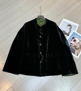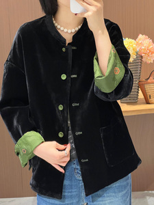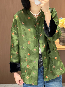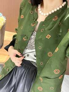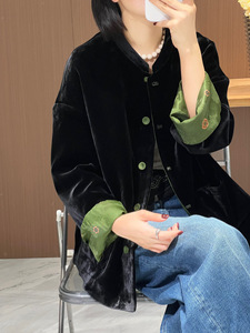 新中式洋气双面穿真丝丝绒面料立领盘扣宽松复古绿色秋季唐装外套