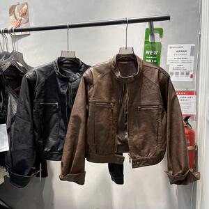 海宁皮衣外套女复古港风圆领宽松夹克上衣小个子美式皮衣机车服潮