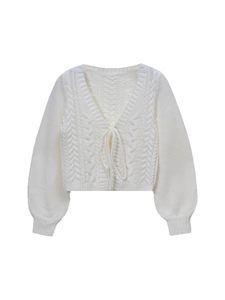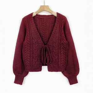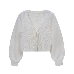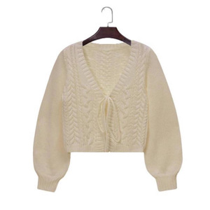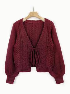 欧美跨境V领系带针织衫休闲开襟灯笼袖麻花针织纯色慵懒毛衣外套