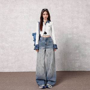 渐变蓝磨破阔腿牛仔裤女早秋季2025新款独特设计感宽松垂感直筒裤