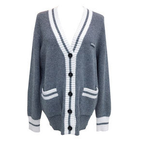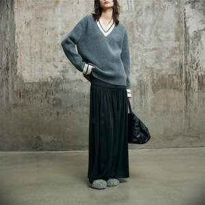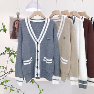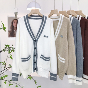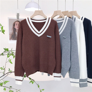 8220 缪系慵懒上衣秋冬季V领撞色高智螺纹粗针刺绣字母针织衫毛衣