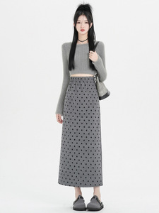 黑色毛呢波点半身裙女秋冬季小个子开叉直筒裙中长款a字包臀长裙