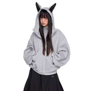 cleanfit灰色杜宾耳连帽卫衣女小众铆钉拼接重磅帽衫短款情侣外套