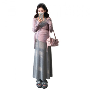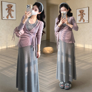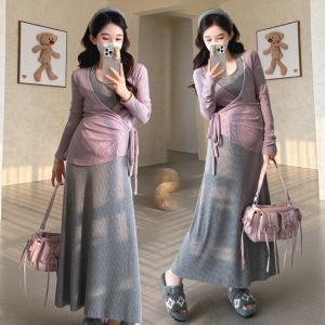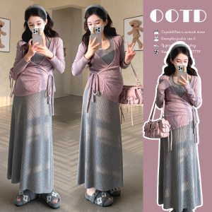 孕妇装春秋高级感套装2025洋气显瘦韩系挂脖吊带连衣裙辣妈两件套