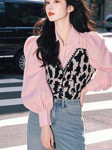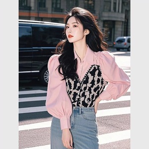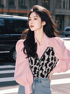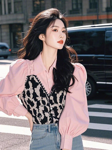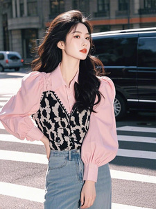 哥家商场同款女装2025秋季设计感粉色碎花拼接假两件衬衫上衣