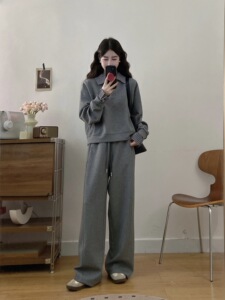 2025年胖mm韩系秋冬季灰色休闲运动套装时尚卫衣阔腿裤长裤两件套