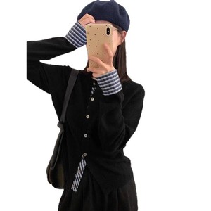 2025春季针织开衫女韩系减龄单排扣上衣外套撞色格纹拼接黑色毛衣