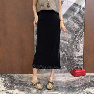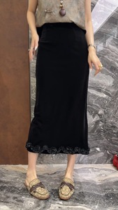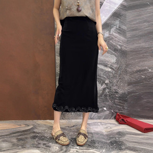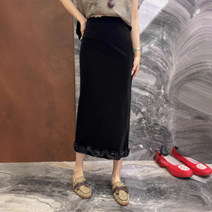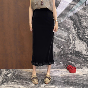 25早秋爆款法式欧货直筒木耳边下摆显瘦丝绒半身裙优雅气质中长裙