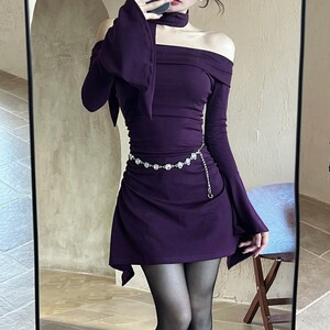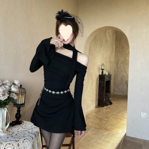 2025秋季新款法式心机别致设计感百搭一字肩喇叭袖飘带连衣裙女