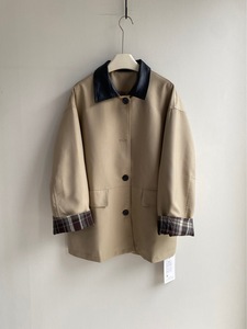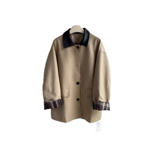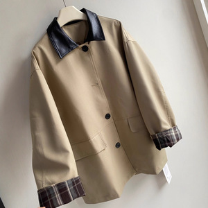 韩系拼pu领翻领复古格子拼接廓形风衣外套女2025秋新款9906