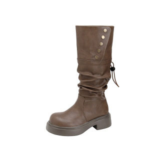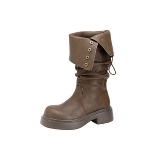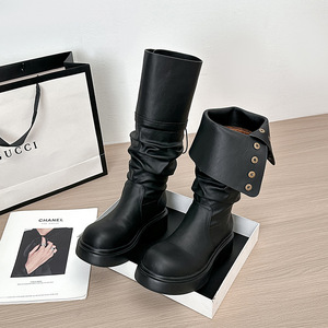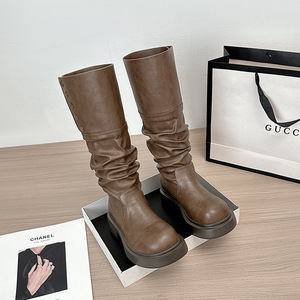 真皮~秋冬褶皱堆堆靴两穿可翻折棕色长筒靴粗跟厚底不过膝骑士靴