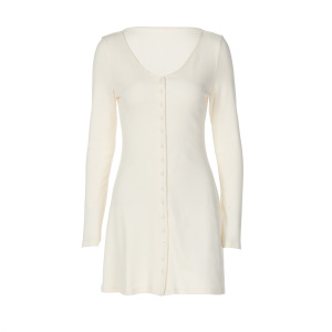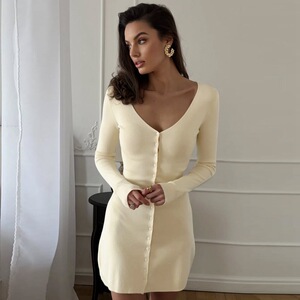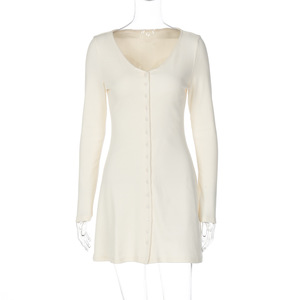 2025秋季新款女装纯色基础款长袖V字领单排扣收腰显瘦连衣裙