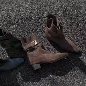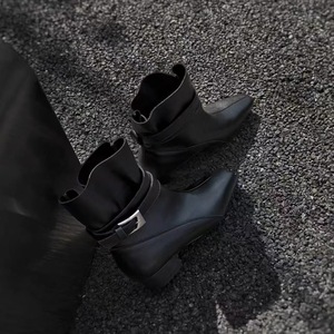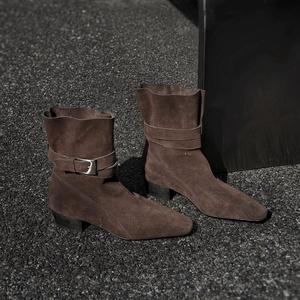 复古英伦风气质时尚套筒两穿方头短靴女皮带扣粗跟束口时装马丁靴