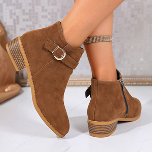 外贸大码马丁靴女2025新款侧拉链皮带扣方跟尖头绒面欧美外穿女靴