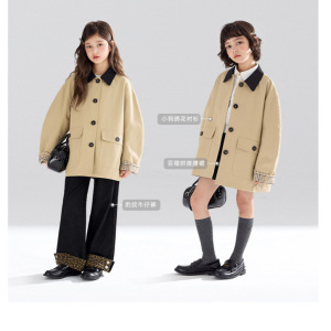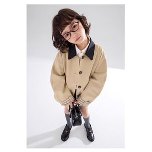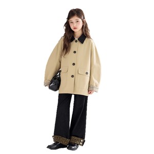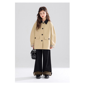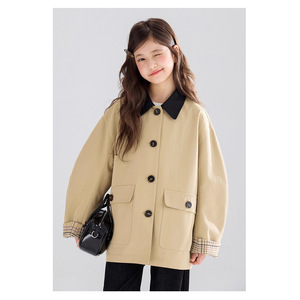 儿童复古撞色翻领风衣夹克袖口拼格纹外套2025年女童秋季新品