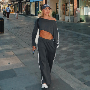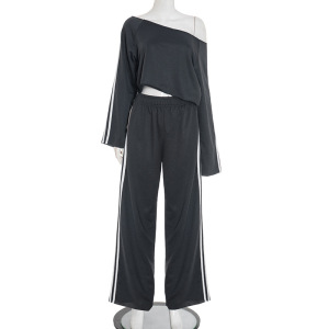 C25ST260欧美女装秋季新款拼色露肩休闲长袖露脐上衣直筒长裤套装