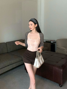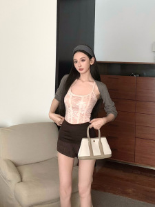 纯欲风套装U领蕾丝吊带内搭长袖披肩外搭高腰修身包臀短裤子女装