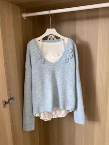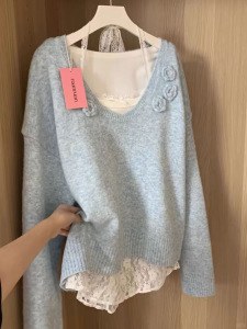 假两件设计感蕾丝拼接挂脖长袖t恤女秋冬内搭打底衫辣妹修身上衣