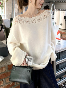 美利奴羊毛镂空花边一字领针织衫女秋长袖宽松慵懒上衣