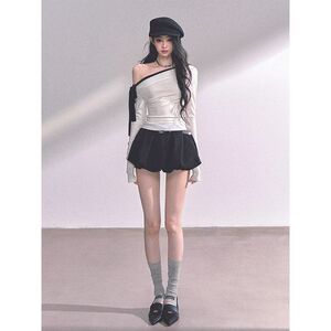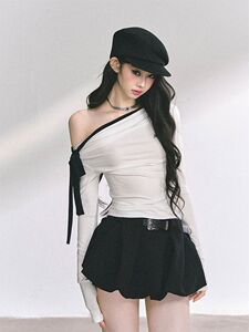甜欲漩涡 白色斜肩T恤+黑色半身裙 套装