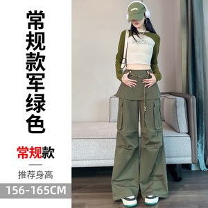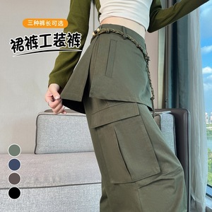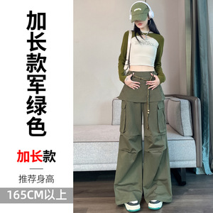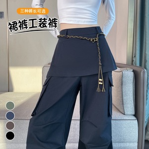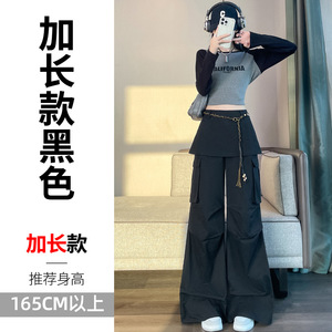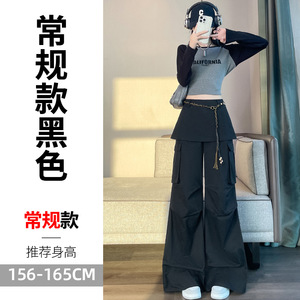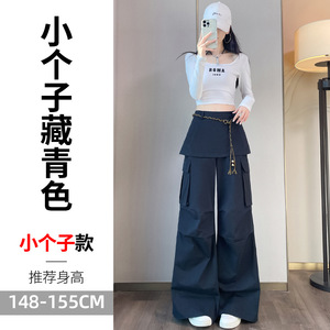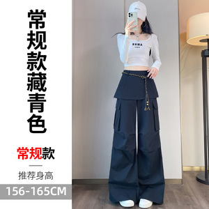 拉夏贝尔藏青色屁帘假两件工装裤女秋冬季高腰宽松垂感阔腿拖地裤