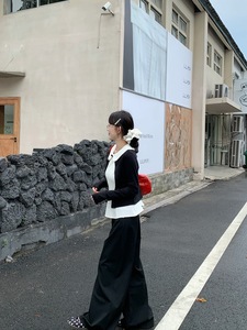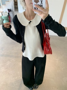 甜美风套装长袖开衫外套女娃娃领背心秋季黑色阔腿裤miu系三件套