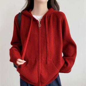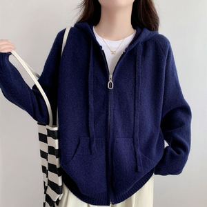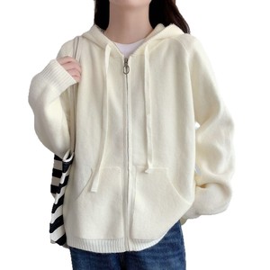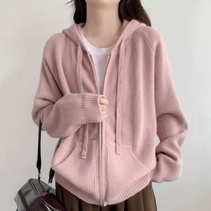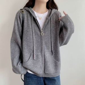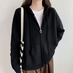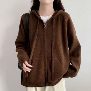 韩系慵懒风宽松针织衫上衣秋冬灰色拉链开衫外套新款连帽毛衣女