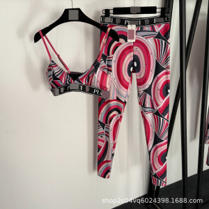 25新款瑜伽运动套装拼色印花 带胸垫吊带背心+弹力修身小脚打底裤