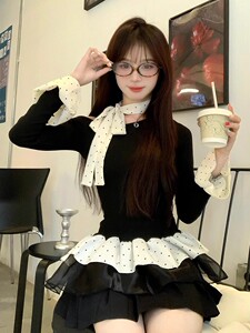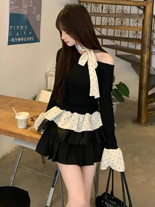 韩系波点荷叶边下摆长袖t恤女秋新款拼接别致系带露肩显身材上衣
