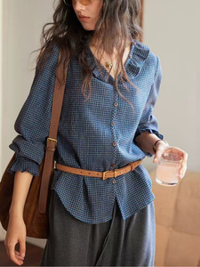 【新品】solighter 法式复古V领荷叶边格子衬衫女秋季别致衬衫