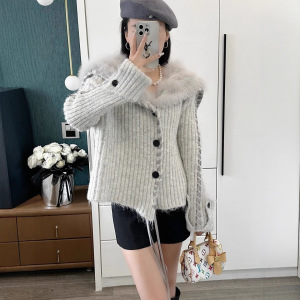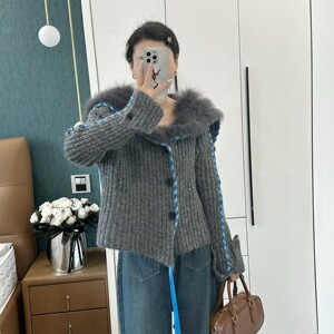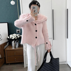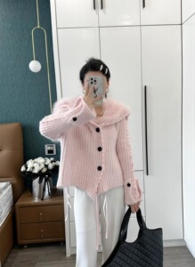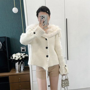 秋冬新款毛毛拼接海军领针织外套女时髦百搭手工穿绳飘带毛衣开衫