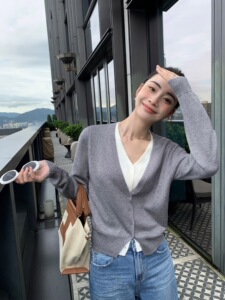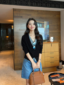 pusumede 复古收藏家 V领假两件针织开衫女宽松气质薄款外套上衣