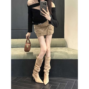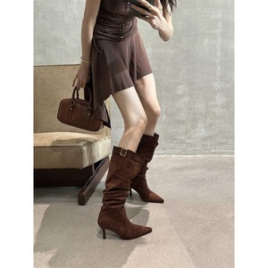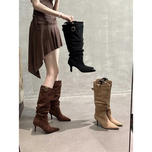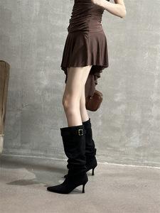 高跟不过膝长筒靴女瘦瘦靴皮带扣细跟尖头堆堆长靴