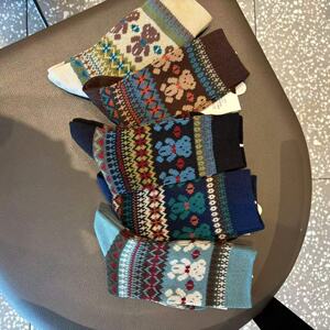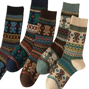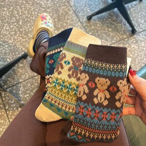 日系小熊可爱袜子女款中筒袜双针双路秋冬复古民族风棉袜潮流韩版