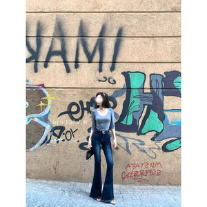 大也池蓝色修身提臀微喇叭牛仔裤女高腰显瘦长裤弹力毛边裤子
