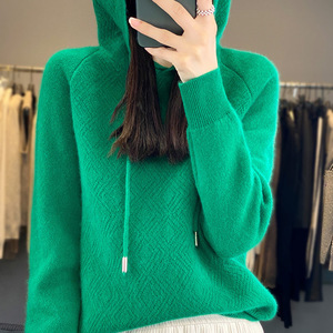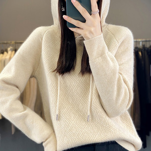 休闲秋冬季菱形格长袖百搭套头针织帽衫宽松简约纯色女士打底卫衣