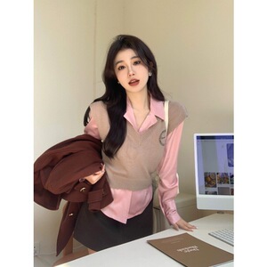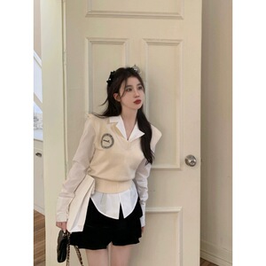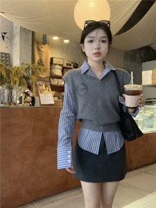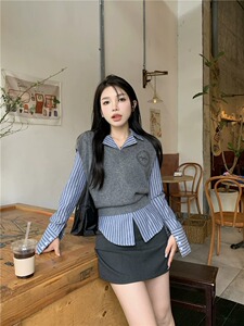 早秋假两件polo领上衣条纹衬衫复古学院叠穿背心马甲长袖针织衫
