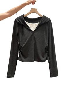 灰色撞色假两件连帽拉链长袖T恤女2025秋季新款掐腰修身上衣潮流1